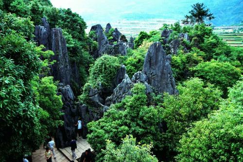 国家级风景名胜区鳞隐石林位于福建省永安市西北部13公里处的大湖镇境内。由鳞隐石林、洪云山石林、十八洞等景区组成,总面积1.85平方公里。喀斯特地貌造就了奇峰异洞和怪石嶙峋,为华东独有。其自然景观地上石林,地下迷宫,得天独厚,鬼斧神工。景区内耸立着石芽、石锥、石柱、石笋400余座,最高达36米。怪石拟人状物,千姿百态。有石猴抱桃、黑熊护笋、八戒照镜、石龟探洞、霸王别姬、老虎扑石、玉兔望月等惟妙惟肖,栩栩如生,被誉为“天然动物园”。鳞隐石林始建于清雍正年间(公元1729年)由大湖太学士赖翘千、赖允升两兄弟开发,历时六年,建有亭、台、楼、阁和又因石鳞隐书院。“鳞隐”取“天故隐其迹”之意,芽表皮呈鱼鳞片状,故而得名。