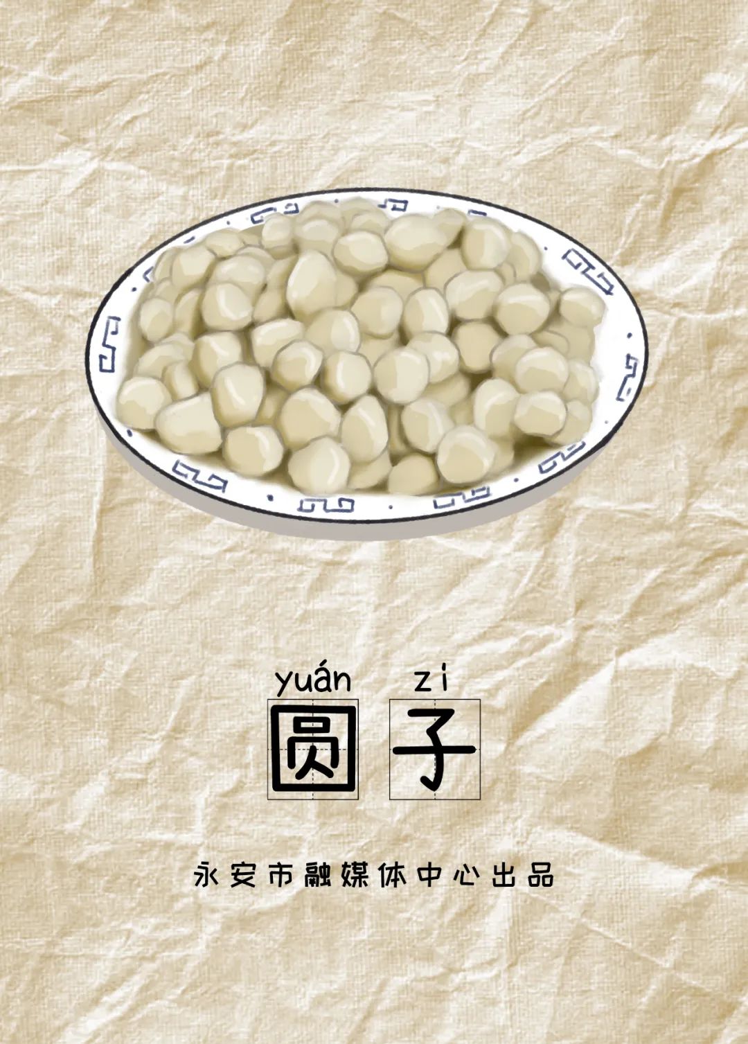 圆子:大米加水浸泡磨成浆,加入少许食用碱,放到热锅内搅拌成浆糊状的浓浆,用手工做成直径1-1.5厘米的圆子。圆子象征吉利,永安一带当地人结婚、做寿、孩子满月等都要吃圆子。