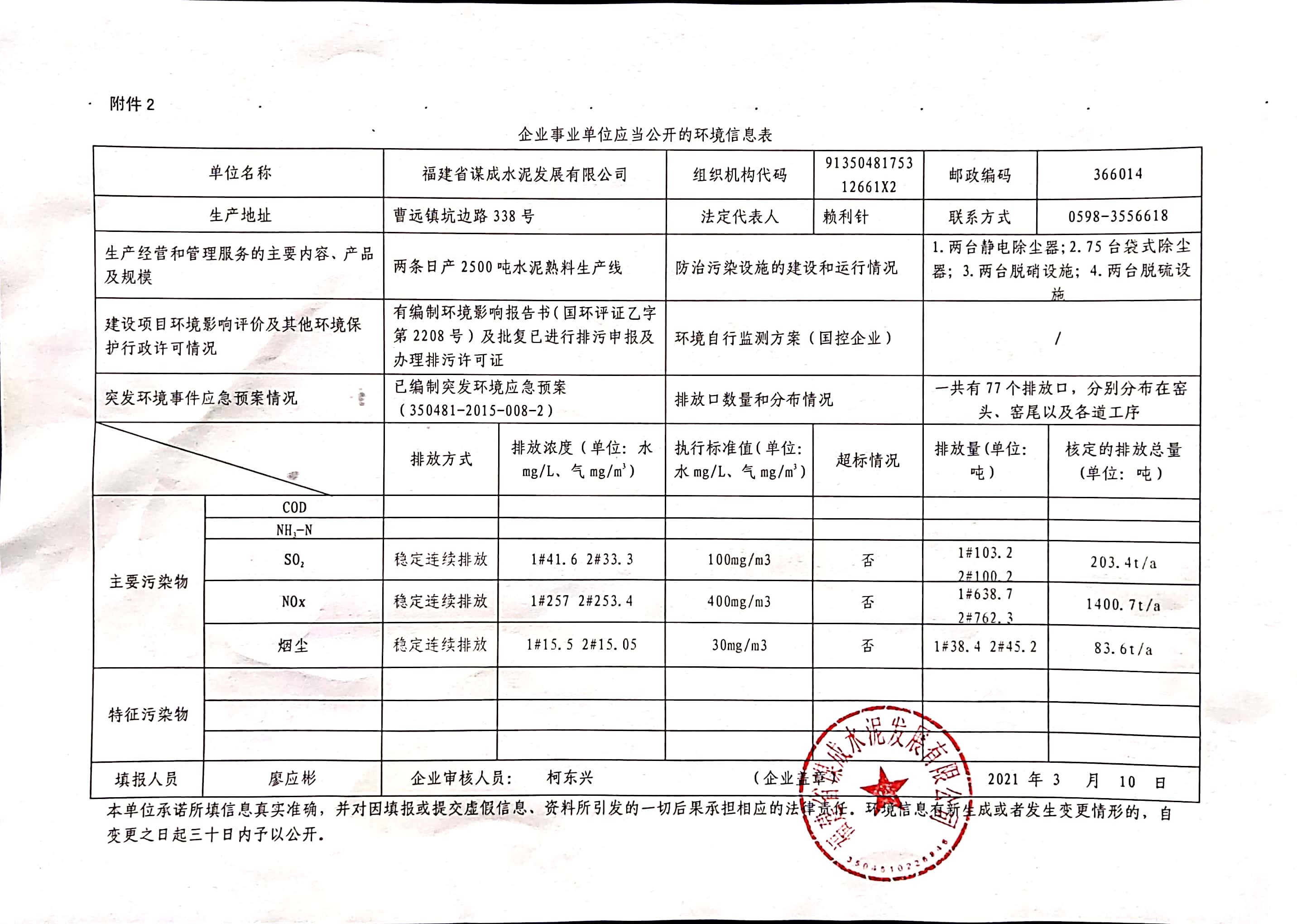 企业环境信息公开(2021年度福建省谋成水泥发展有限公司)