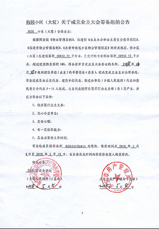 永安市梅园小区(大厦)关于成立业主大会筹备组的公告