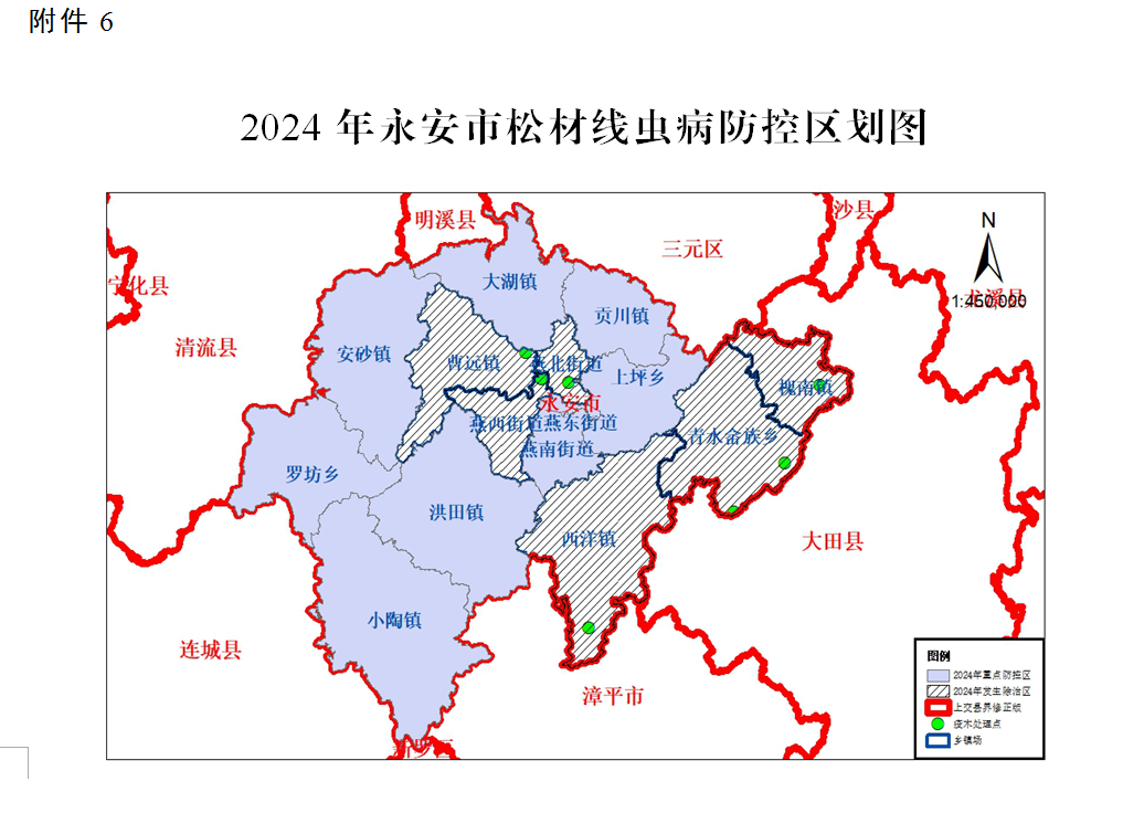 将燕西街道、燕北街道、西洋镇、青水畲族乡、槐南镇、曹远镇6个疫点区域的松林与松木列为发生除治区。并采取以下对策:一是严格检疫封锁,强化疫木除害处理监管,加强对疫木就地除害处理企业检疫执法检查,规范疫木就地除害处理生产流程和企业行为,严防疫木流失而引起疫情的扩散蔓延;二是加强监测普查,及时发现疫情与隐患;三是实施防治性松林采伐改造,快速清除所有松枯死树;四是全面清理死亡松树,实现病死树数量下降;五是综合防治媒介昆虫松墨天牛,促进林分健康生长。