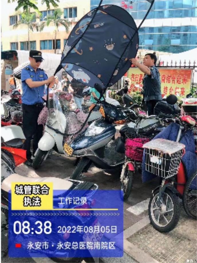 8月5日上午,城管局联合交警、交通、工信等多部门开展文明交通专项整治行动,对燕江中路、南坑路等路段摩托车、电动车违规安装遮阳棚、乱停乱放等不文明行为开展整治,共拆除遮阳棚22顶,纠正摩托车乱停行为5处。