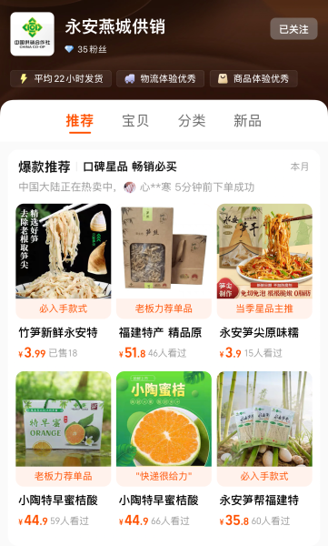 2、“供销+直播”树品牌。永安供销电商直播间于2024年7月底正式投入使用,先后组织开展闽笋、黄椒、特早蜜等特色农产品直播10余场,推出生产、自主研发、自主经营的“笋帮”系列产品,包括碳烤笋尖、精品原生态笋丝、手剥笋等,也涵盖永安金线莲、吉山老酒等其他永安市特色农产品。