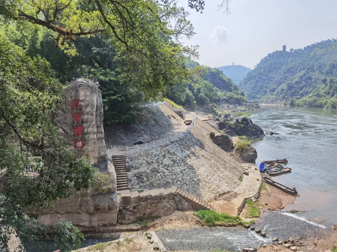 码头有一棵两三百年的大榕树,它虬枝舒展,漫天青翠。树下立有一碑,碑刻四个大字:“红军渡口”。