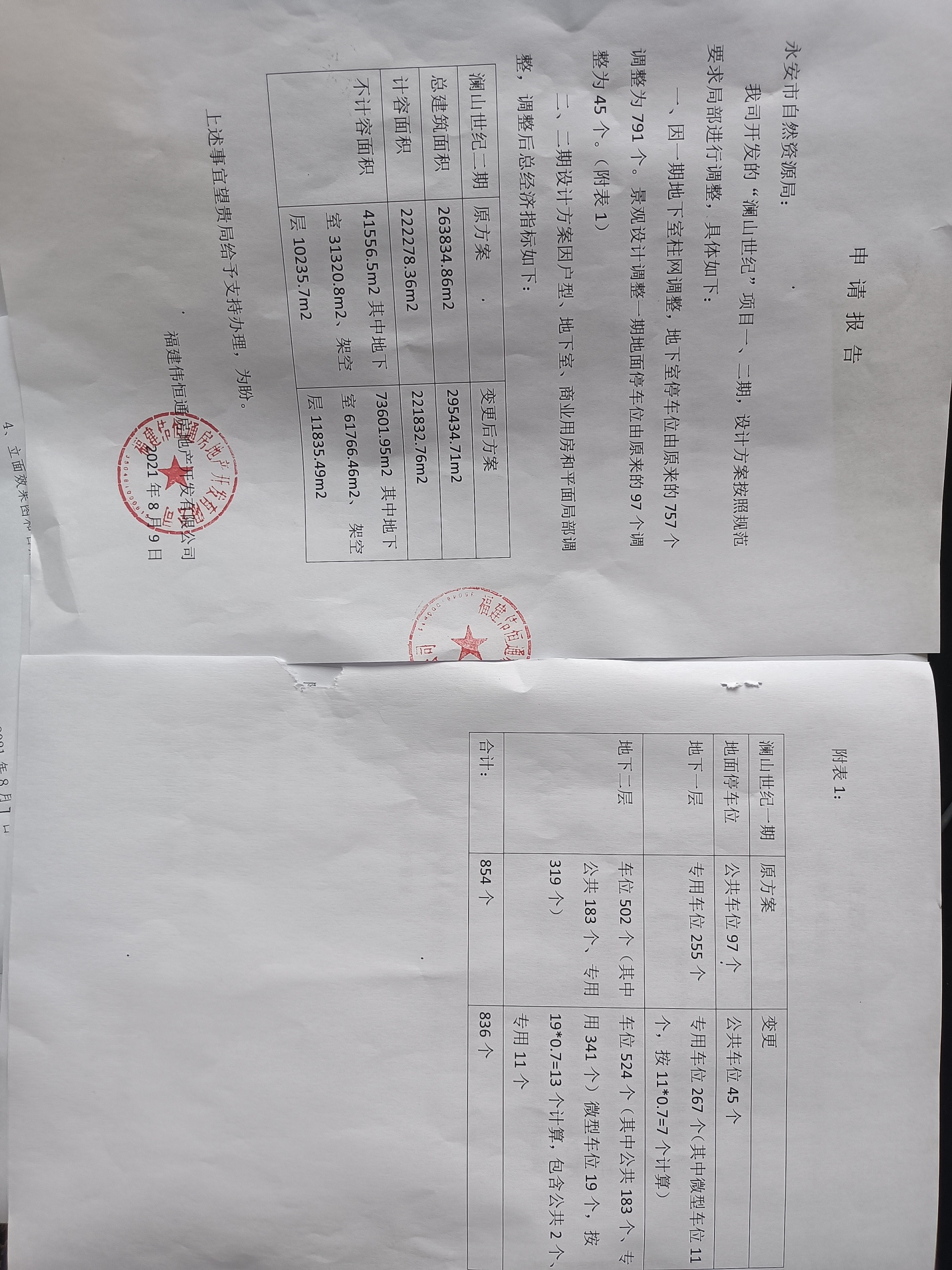 2021年8月9日,福建伟恒通房地产开发有限公司向我局申请对澜山世纪一期地下停车位和二期方案进行调整,具体如下: