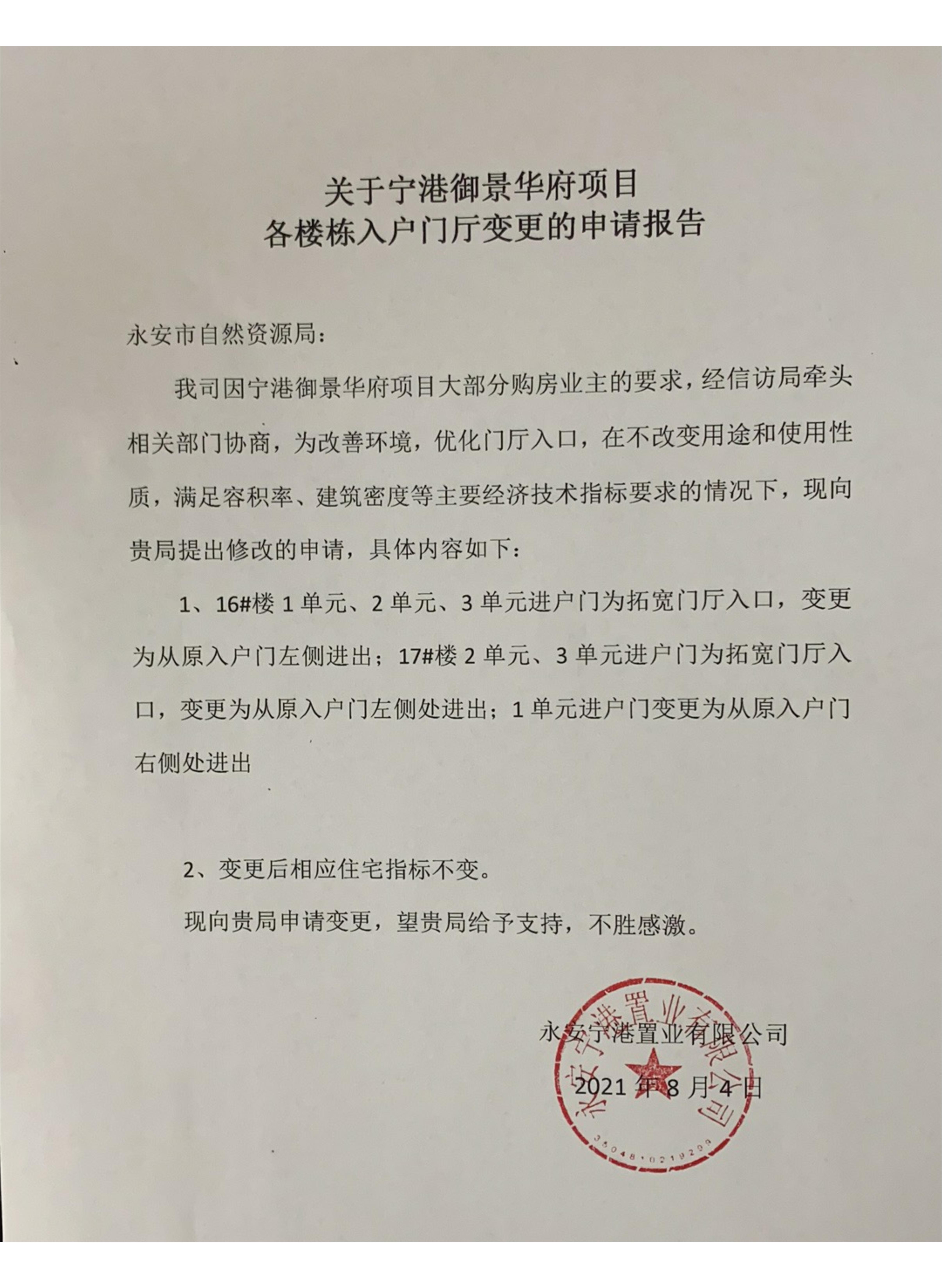 2021年8月4日,永安宁港置业有限公司向我局申请对宁港华府16#、17#楼入户门厅进行优化调整,方案调整后计容建筑面积、建筑密度保持不变,符合规划条件要求。