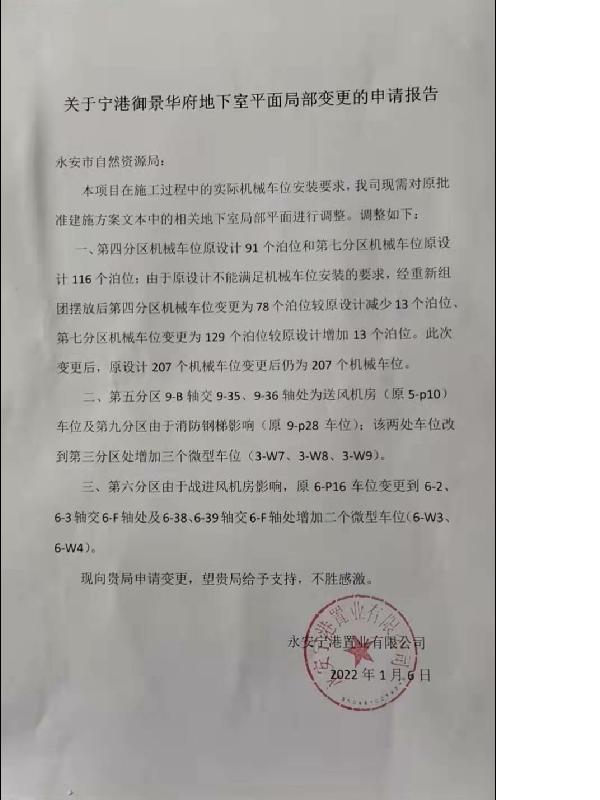 永安市自然资源局关于宁港御景华府地下室机械停车位局部调整的公示