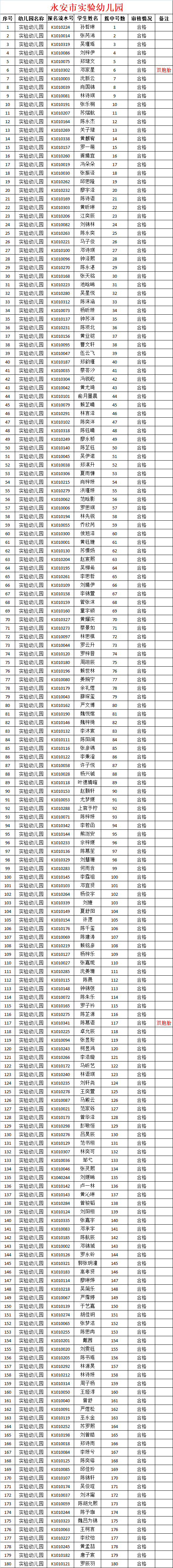 永安市2022年秋季城区公办幼儿园小班招生于6月29日通过电脑摇号产生675名预录取对象(其中实幼180名、机幼175名,燕南180名,燕东140名)。根据2022年我市城区公办幼儿园招生工作有关要求,幼儿园招生工作小组对675名预录取对象的房产、户籍等信息逐一核查,有1名对象的房产信息不符合录取要求(具体名单见附件1),同时根据“出现材料不符合的,按摇出的顺序号依次进行递补和材料审核”的规定和程序,最终确认1名递补录取对象(具体名单见附件2)。现将各园正式录取名单公布如下: