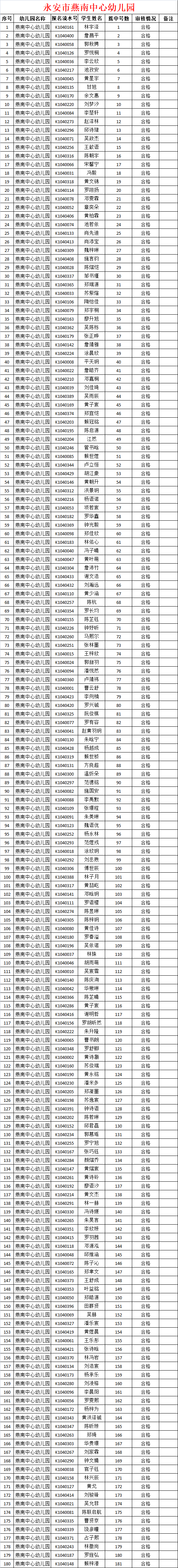 永安市燕南中心幼儿园正式录取名单