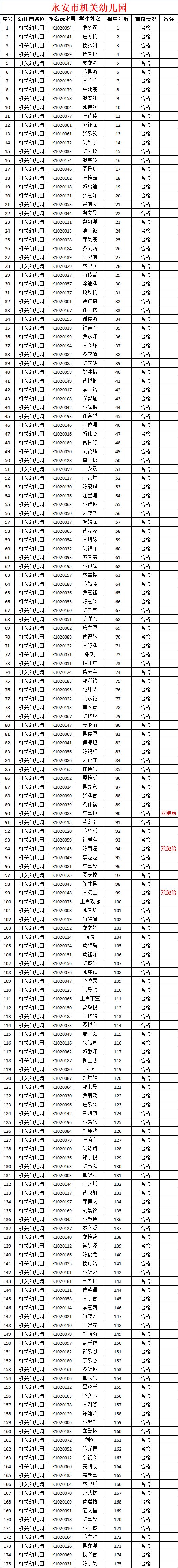 永安市机关幼儿园正式录取名单