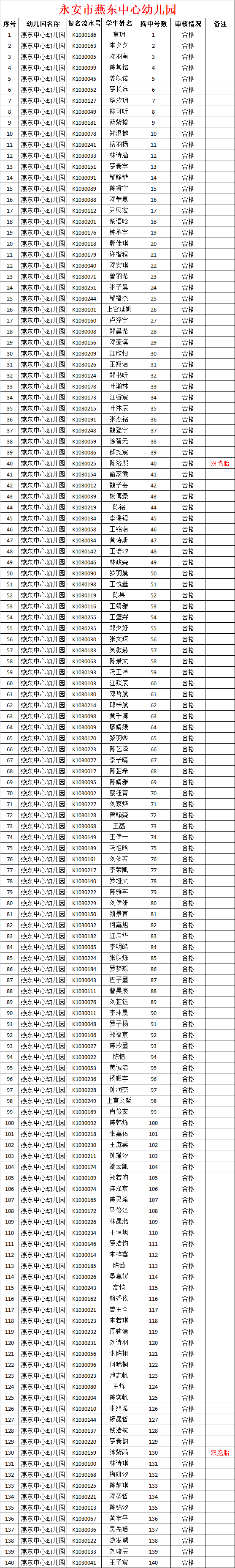 报名燕南中心幼儿园:流水号K1040148,幼儿姓名:赖梓濠,摇中号数181;经审核,该对象的信息符合录取要求,予以递补录取。