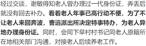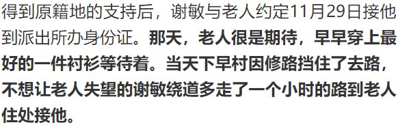 看着崭新的身份证,老廖喜笑颜开。“有身份证了,我们今天带你去办理低保和养老院入住手续。”可这时,老廖却舍不得离开……