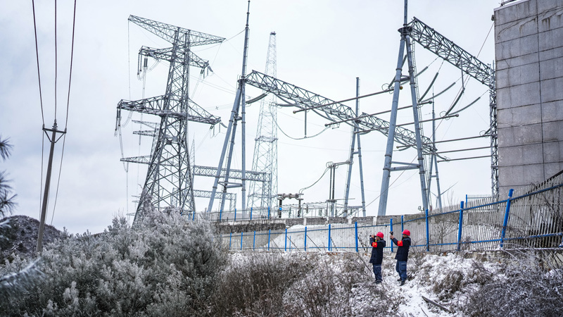 南方电网六盘水钟山供电局工作人员对辖区内线路进行覆冰观测(2025年1月26日摄)。新华社记者 陶亮 摄