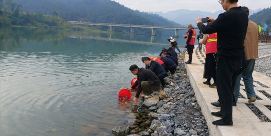 简短的启动仪式结束后,验收组和监督组的工作人员对鱼苗进行检查和验收,确保鱼苗符合放流的标准。来到霞鹤村沙溪河畔,在大家的集体见证下,工作人员和志愿者将一桶桶鲜活的鱼苗来到河边,先往桶里泼入河水平衡水温后,再缓缓地将鱼苗放入河中,每一尾小鱼都欢快地畅游在沙溪河里,回归大自然的怀抱,为“母亲河”生态增添新的生机和活力。