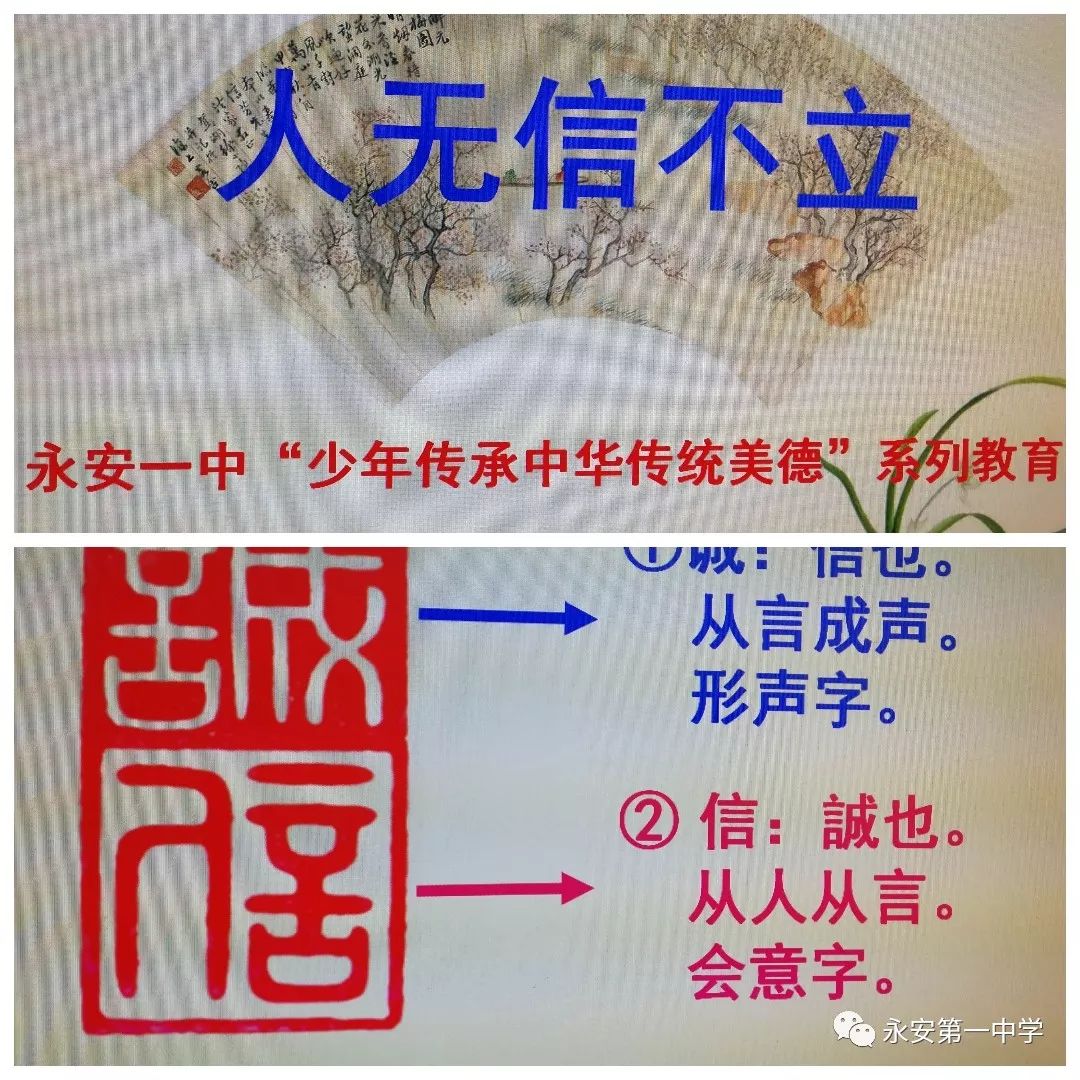 “诚实守信”是中华民族的优良传统,是做人之本,立德之源。为创建诚信的校园环境,进一步增强学生诚信意识,深化社会主义核心价值观,永安一中开展了“少年传承中华传统美德”诚信教育活动——“人无信不立”。